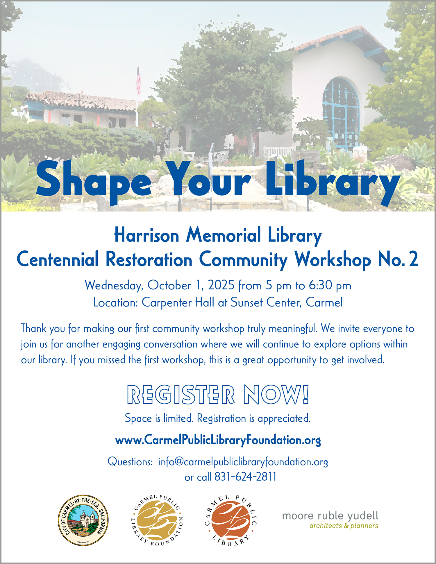 Contact the Carmel Public Library Foundation CEO Alexandra Fallon at (831) 624-2811 or afallon@carmelpubliclibraryfoundation.org to learn more. Please donate to the Harrison Memorial Library Centennial Restoration here.